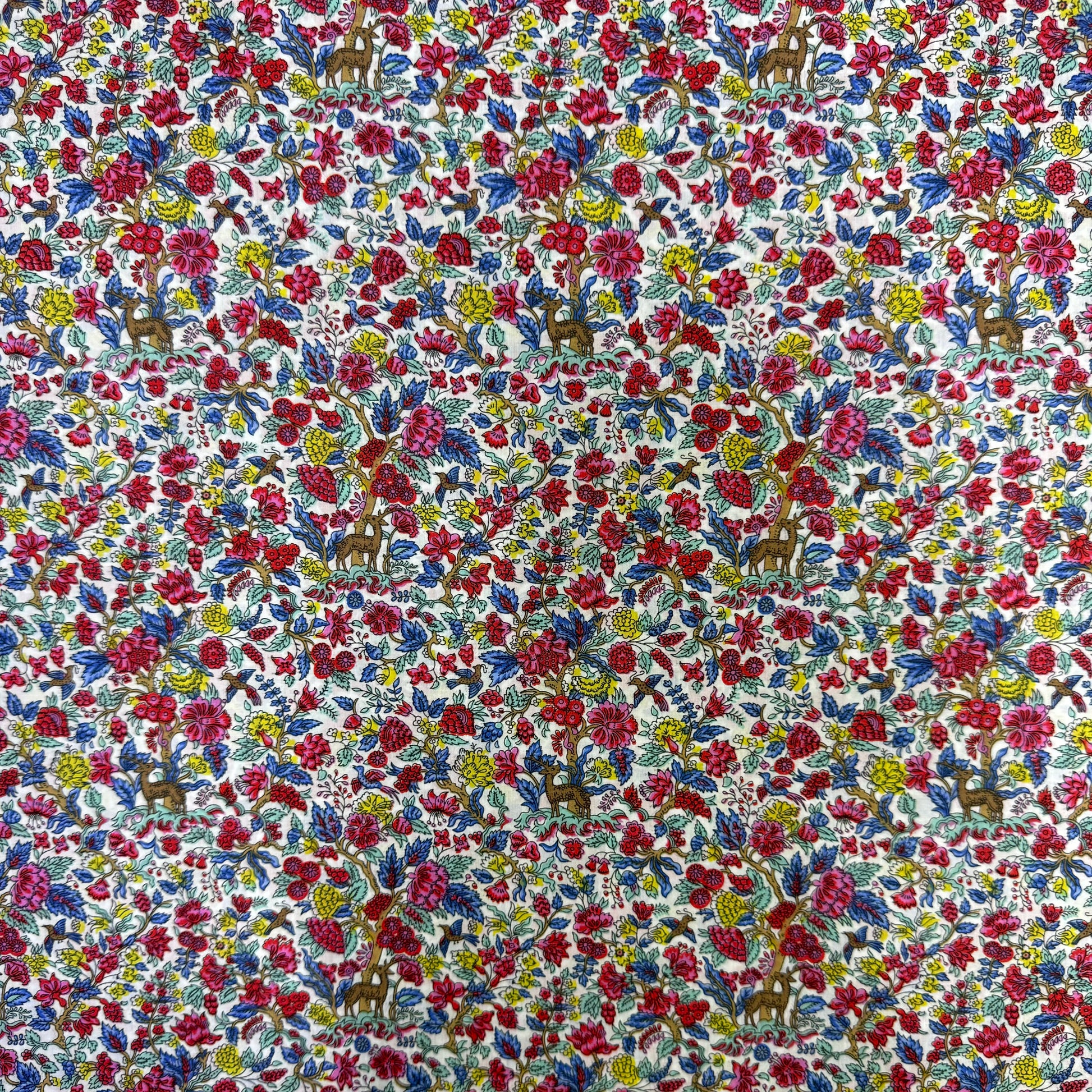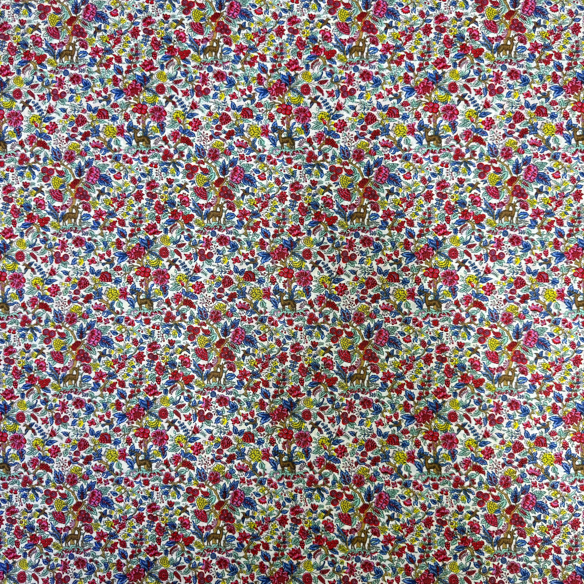 Salters Forest is an enchanting conversational design, based on a Liberty archive print dating from the 1940s. Reimagined as a celebration of Artemis, the ancient Roman goddess of the wild, this artwork depicts an imaginary landscape of blossoming flowers and lush vegetation as a rich Tree of Life tapestry unfolds, revealing playful illustrations of birds and deer. Salters Forest is part of the Earth story of our Autumn/Winter 2023 collection – a tribute to the earth’s bounty, these designs immerse us in the captivating details of the natural world.