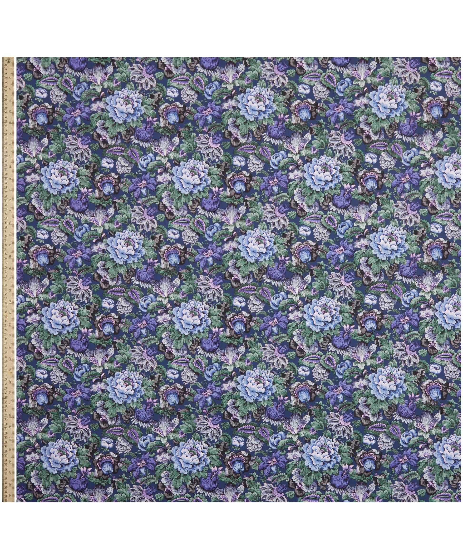 Inspired by a hand-painted artwork discovered in the Liberty archive, this opulent botanical showcases an abundance of magnificently displayed blooms. The unfurling petals of peonies, chrysanthemums and lilies gracefully cascade amidst a tapestry of lush foliage, meticulously weaving together a multisensory visual feast.