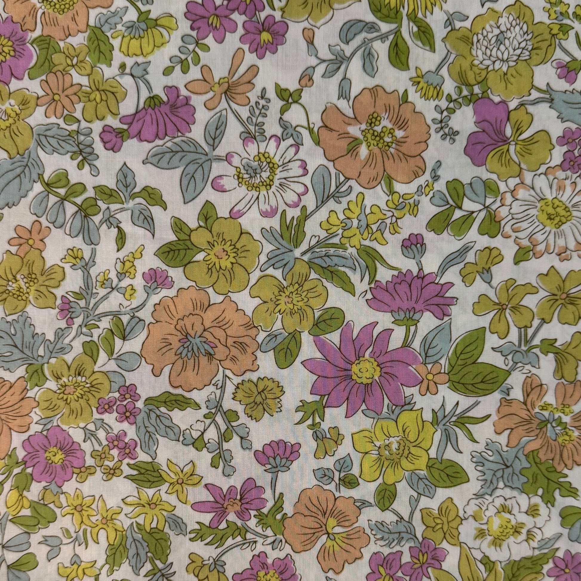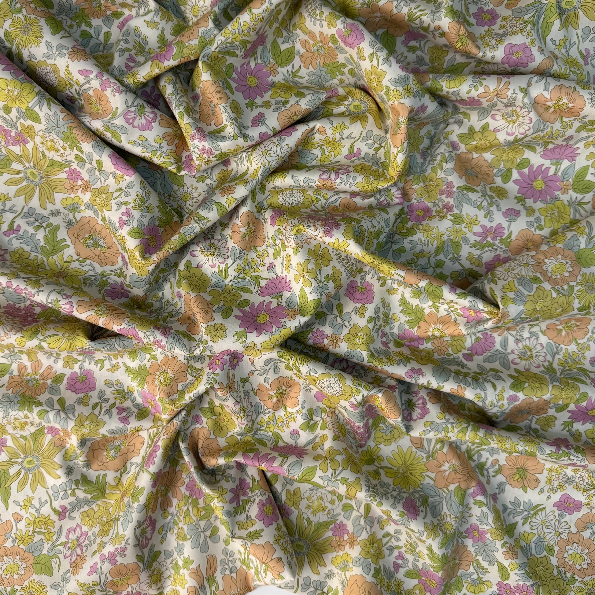 Adapted from a 1940s archival Liberty print, Daisy Morisia is a joyous meadow, teeming with an array of springtime blooms. Pansies, poppies, geraniums, roses, sweet peas, daisies, marguerites, and geum flowers come together to create a quintessential Liberty botanical. The design evokes a sense of romance and nostalgia, capturing the timeless charm of classic English flora.
