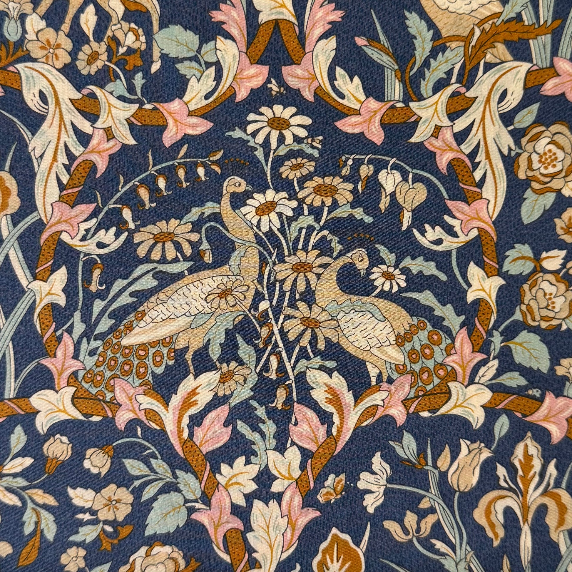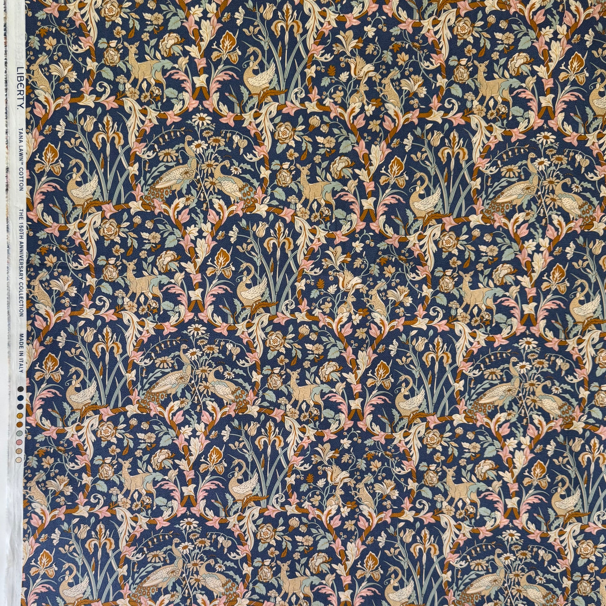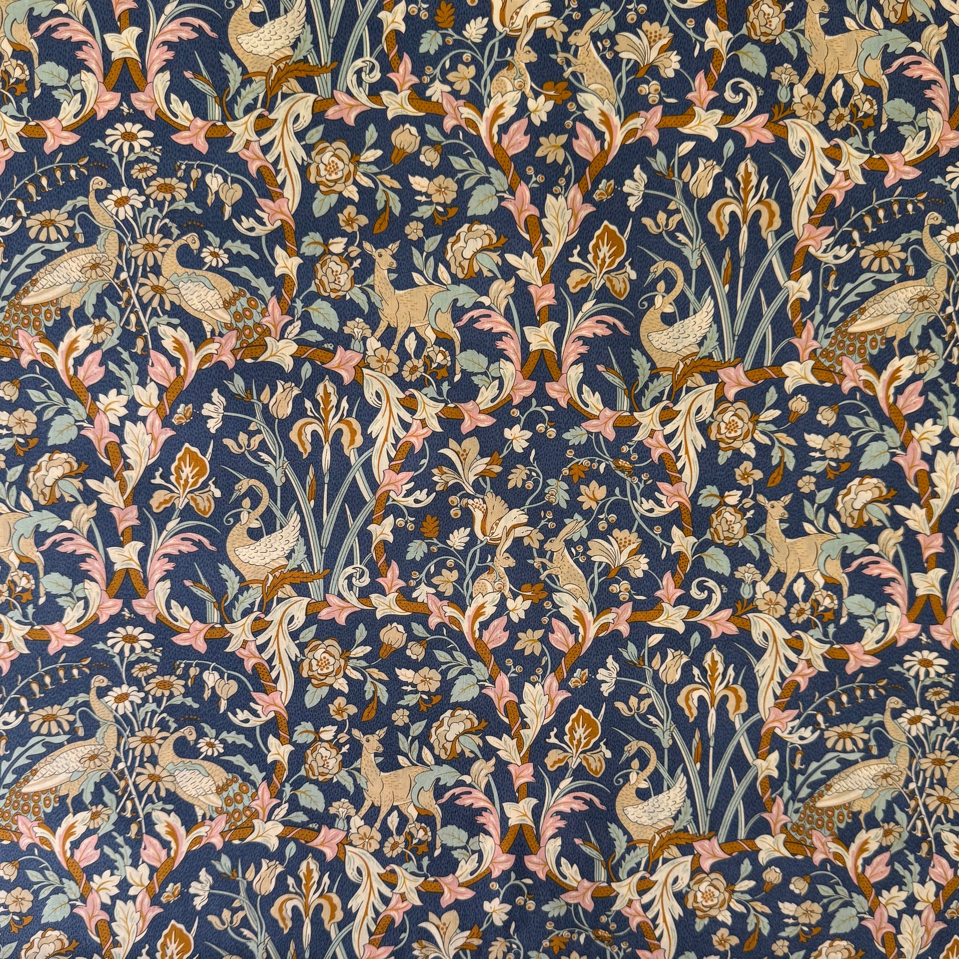 Hand-painted in the Liberty studio, Joan tells a poignant story of collaboration across generations. This Arts & Crafts style conversational is a modern iteration of Walter Crane’s timeless ‘The Four Seasons’ textile pattern. Looking through four vignettes framed by trailing ivy, each floral scene symbolises a distinct season, teeming with nature’s wonders. Amidst delicate roses, bluebells, tulips, daisies and irises, one discovers a lively cast of characters: peacocks, butterflies, swans, hares, frogs, bees, and deer. This print is part of the second chapter of this collection, Collaboration, which reflects the current design team’s celebration of the techniques and styles of their predecessors - bridging the gap between past and present.